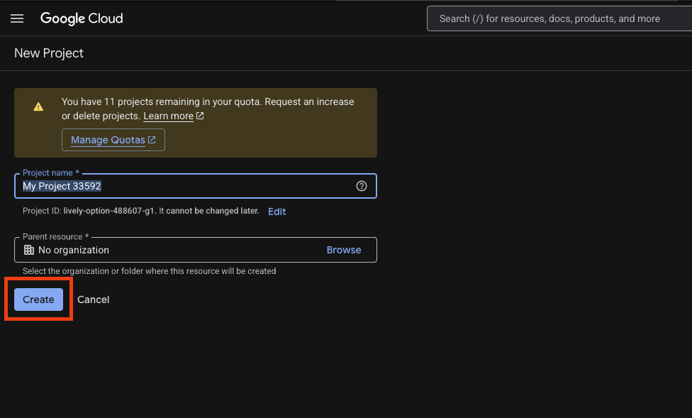 ในช่อง Project name ให้ตั้งชื่อโปรเจกต์ตามต้องการ จากนั้นดำเนินการต่อโดยคลิกปุ่ม Create
