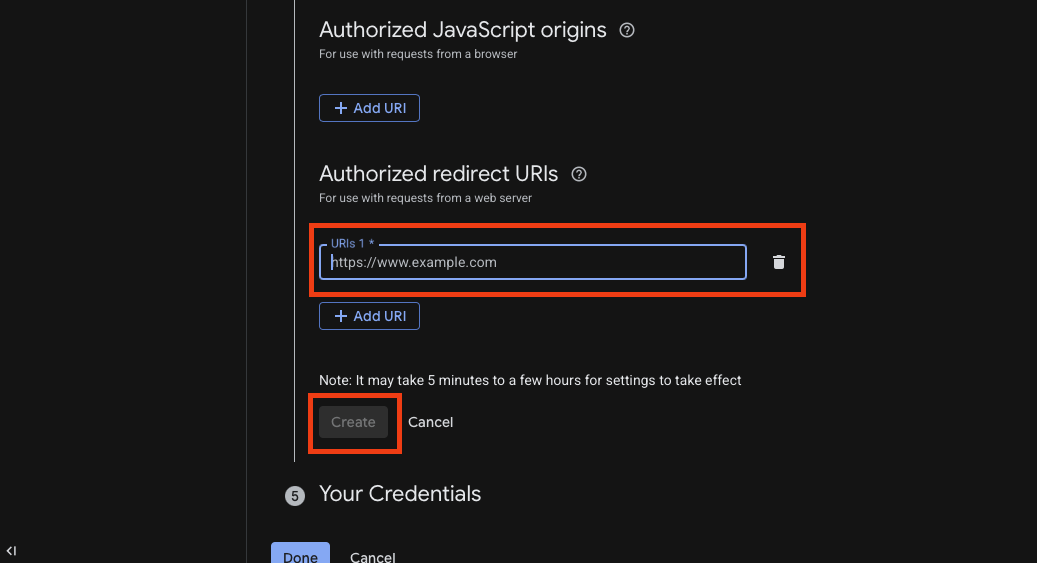 จากนั้นให้เพิ่มค่า Authorized redirect URIs และคลิกปุ่ม Create ตามที่แสดงในภาพด้านล่าง: