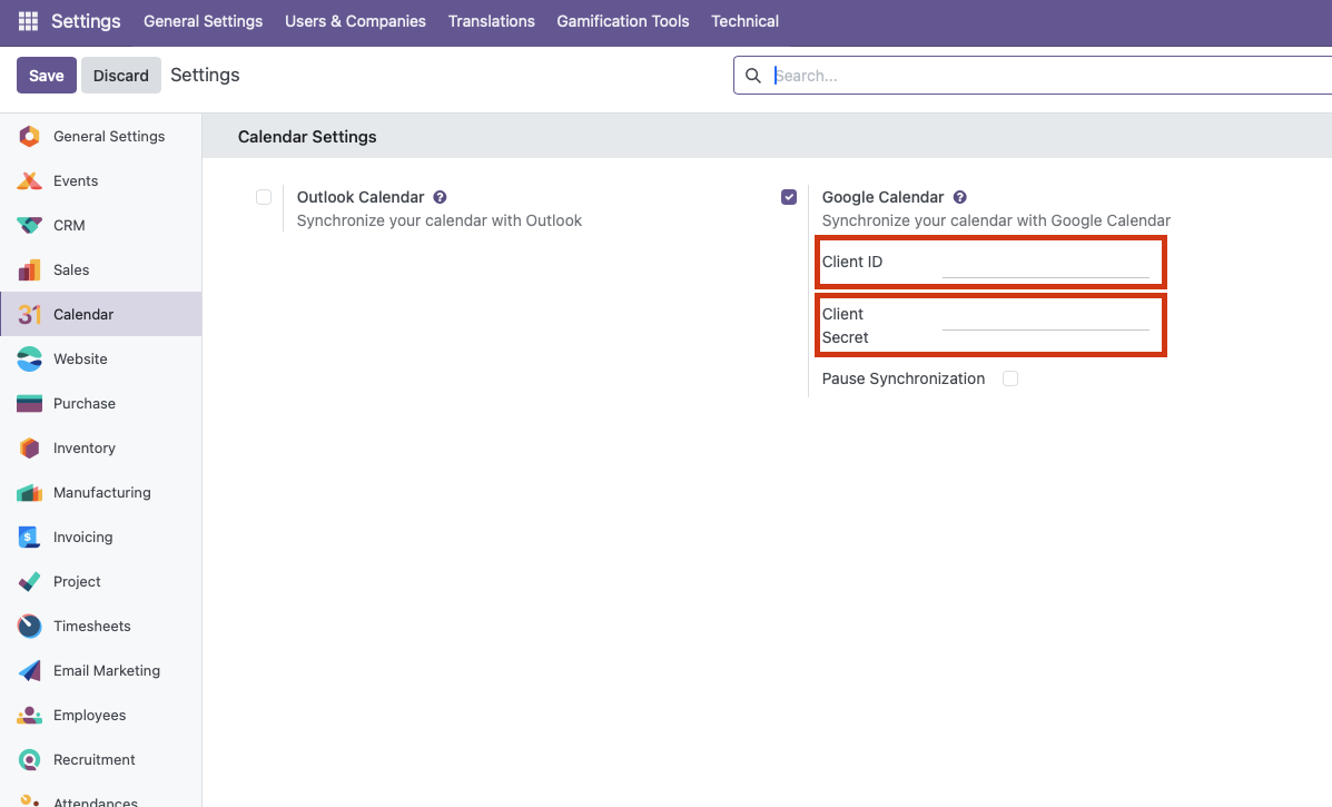 เมื่อได้ค่า Client ID และ Client Secret แล้ว ให้เข้าไปที่โมดูล Calendar ใน Odoo