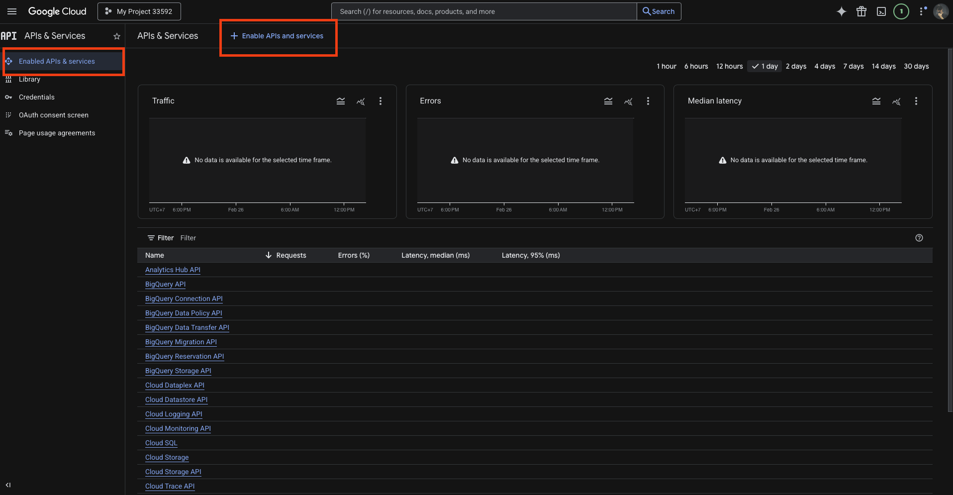 ไปที่เมนู APIs & Services จากนั้นคลิก + Enable APIs and Services เพื่อเปิดใช้งาน API
