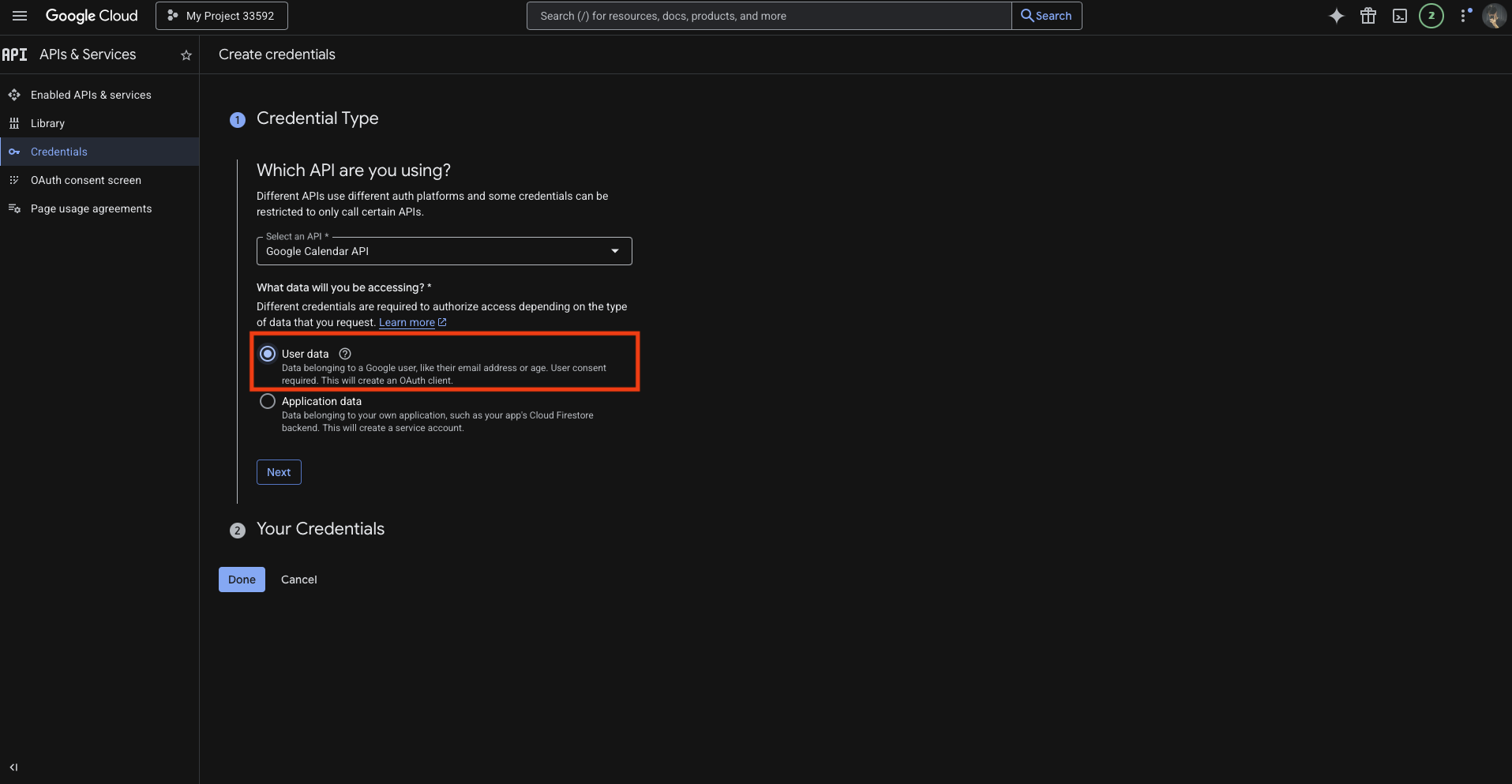 จากนั้นกรอก App name เป็น Google Calendar API และเลือกประเภทการเข้าถึงเป็น User data