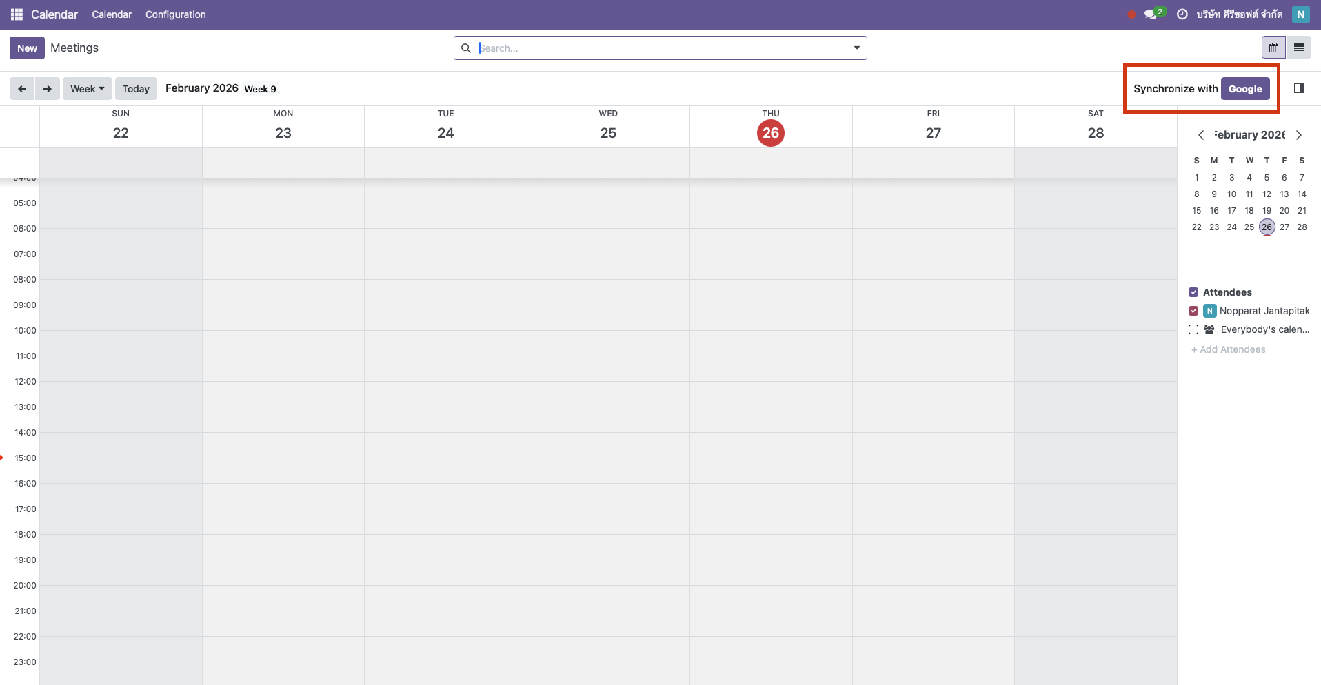เมื่อดำเนินการตั้งค่าทั้งหมดเสร็จเรียบร้อยแล้ว ระบบจะทำการเชื่อมต่อและซิงโครไนซ์ข้อมูลระหว่าง Google Calendar และโมดูล Calendar ของ Odoo โดยอัตโนมัติ