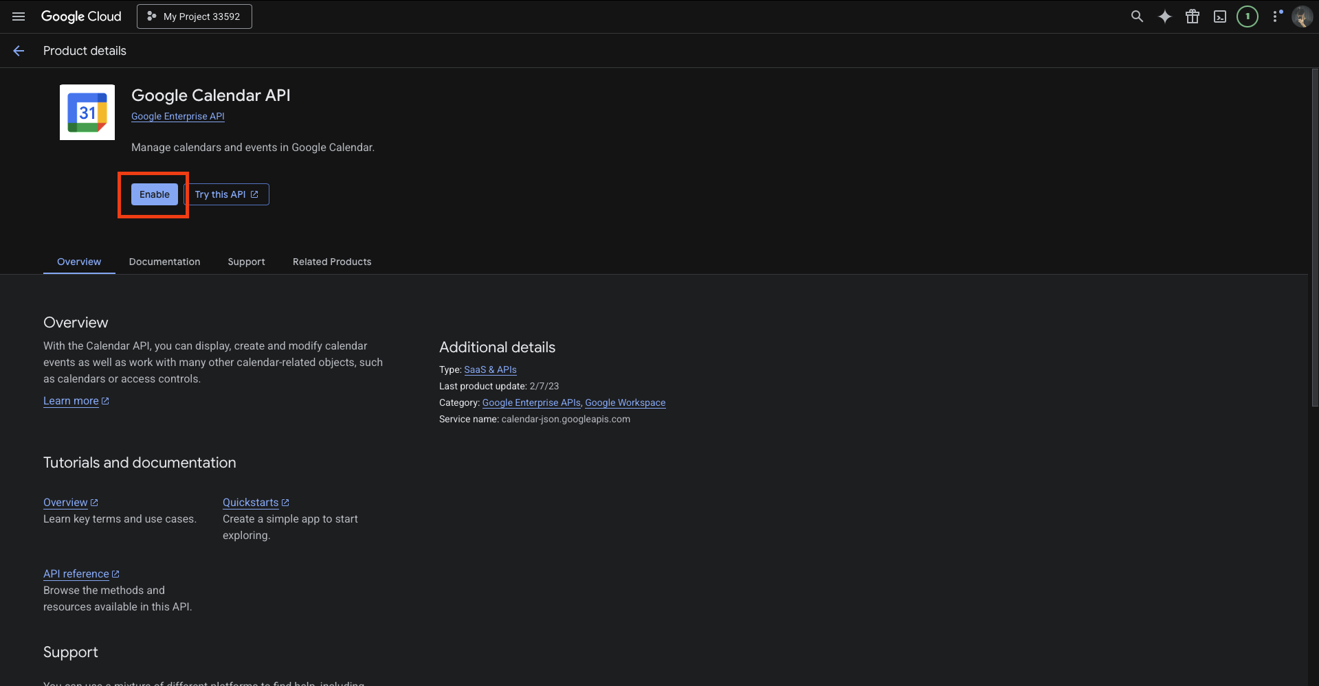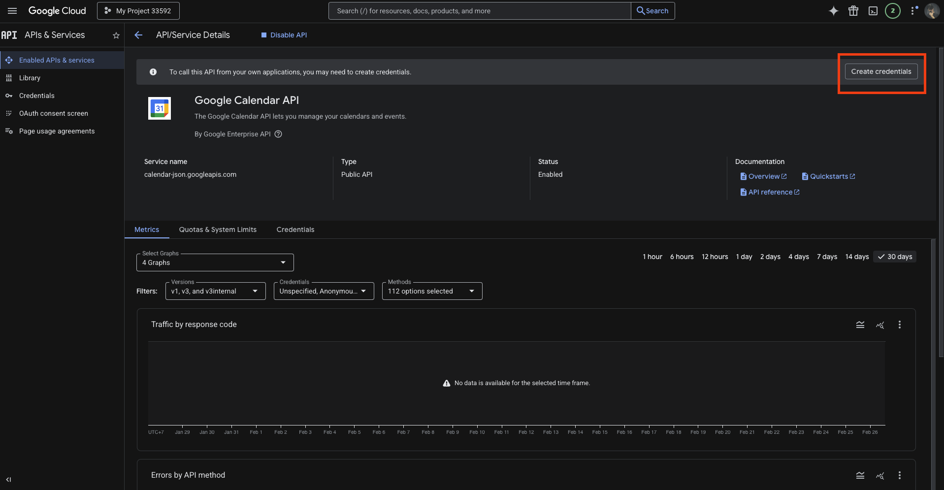 ค้นหา Google Calendar API จากช่องค้นหา (search bar) แล้วคลิกปุ่ม Enable เพื่อเปิดใช้งาน API