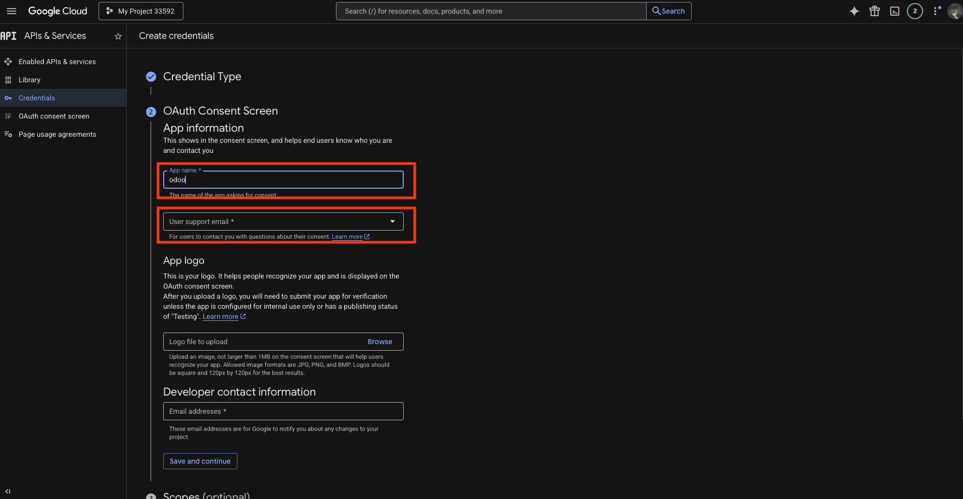 จากนั้นกรอกข้อมูลแอปที่จำเป็นในหน้า OAuth Consent Screen ตามที่แสดงด้านล่าง