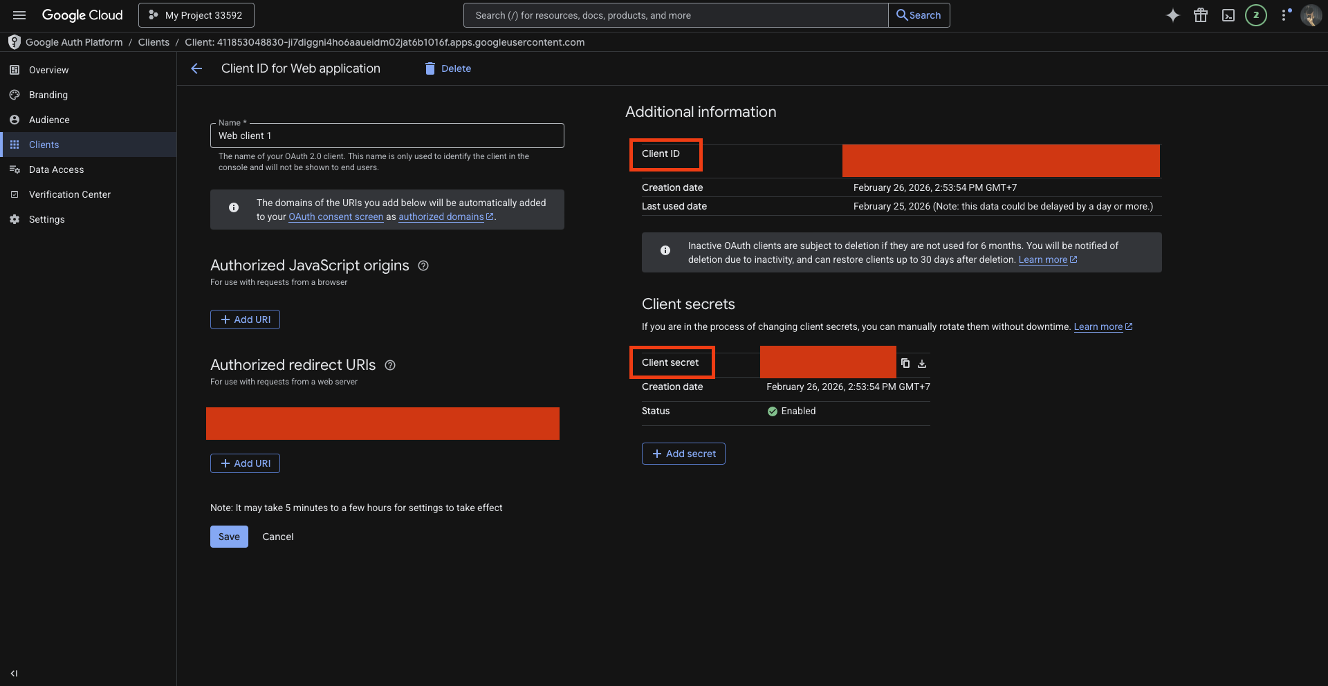 ตอนนี้จะมีค่า Client ID และ Client Secret แสดงอยู่ทางด้านขวาของหน้าจอ ให้ดาวน์โหลดหรือบันทึกเก็บไว้ในที่ปลอดภัย