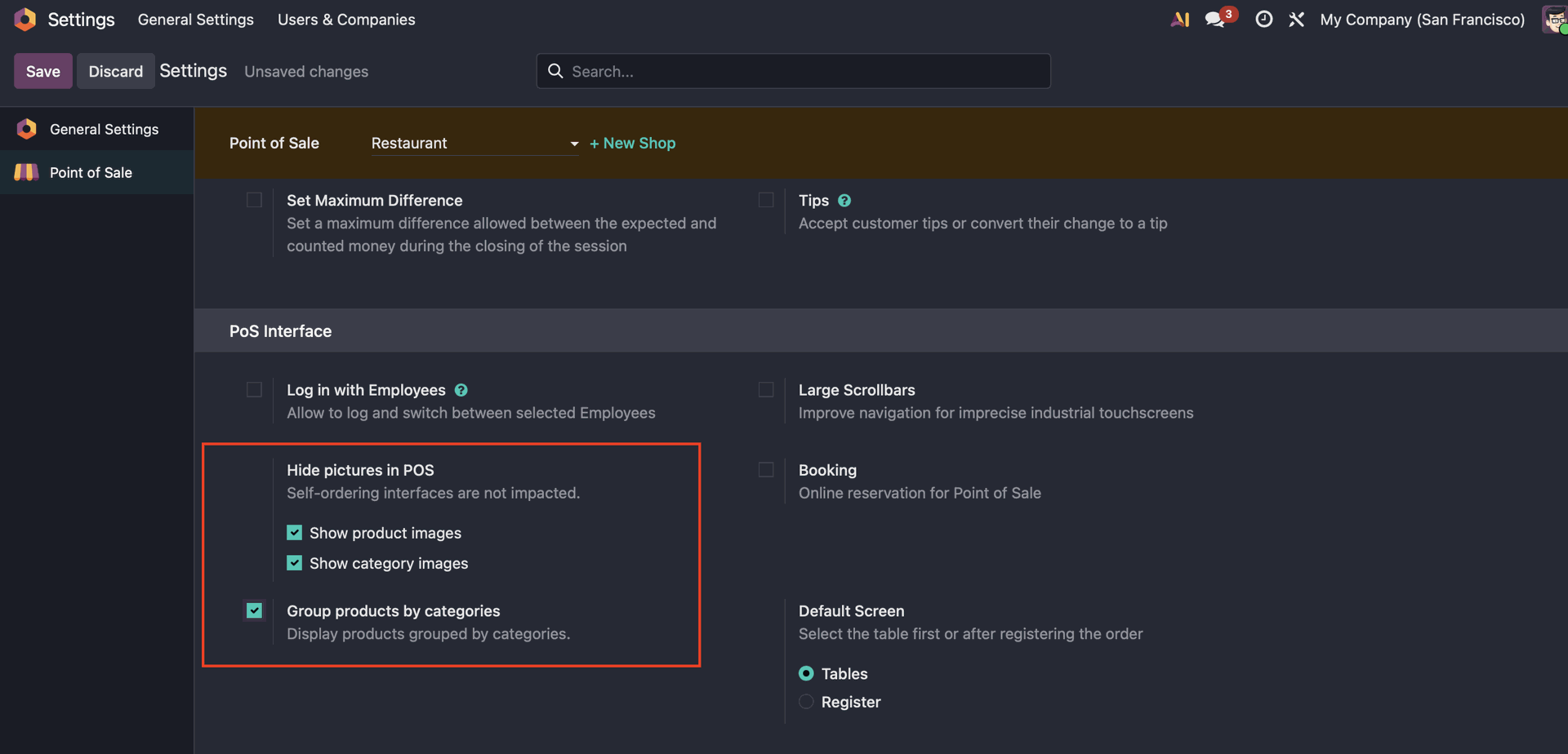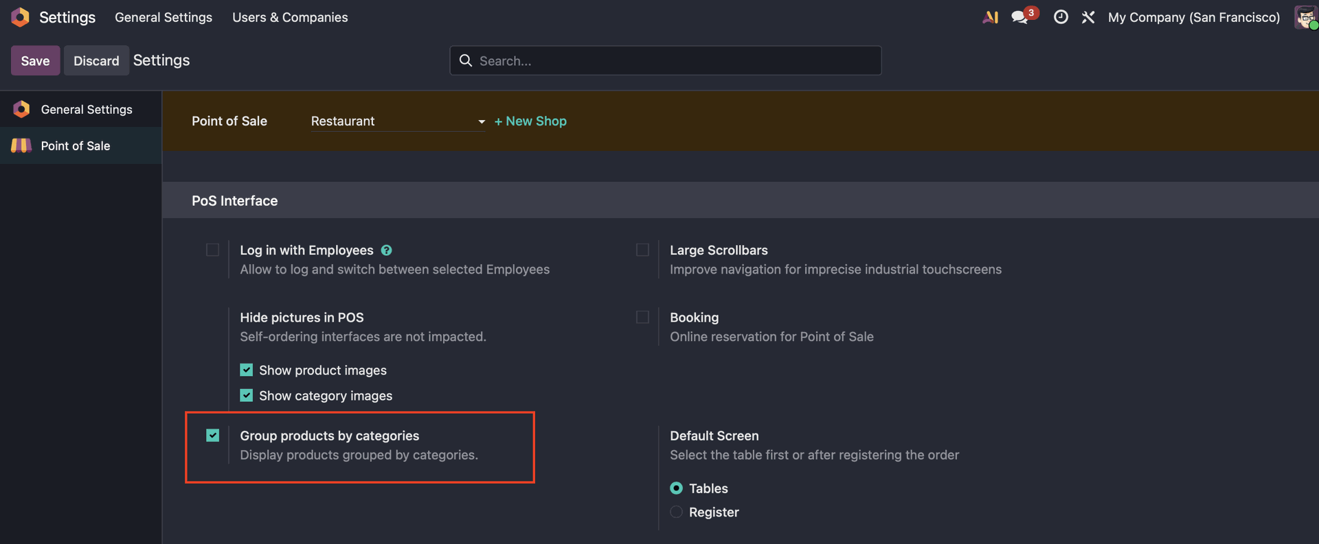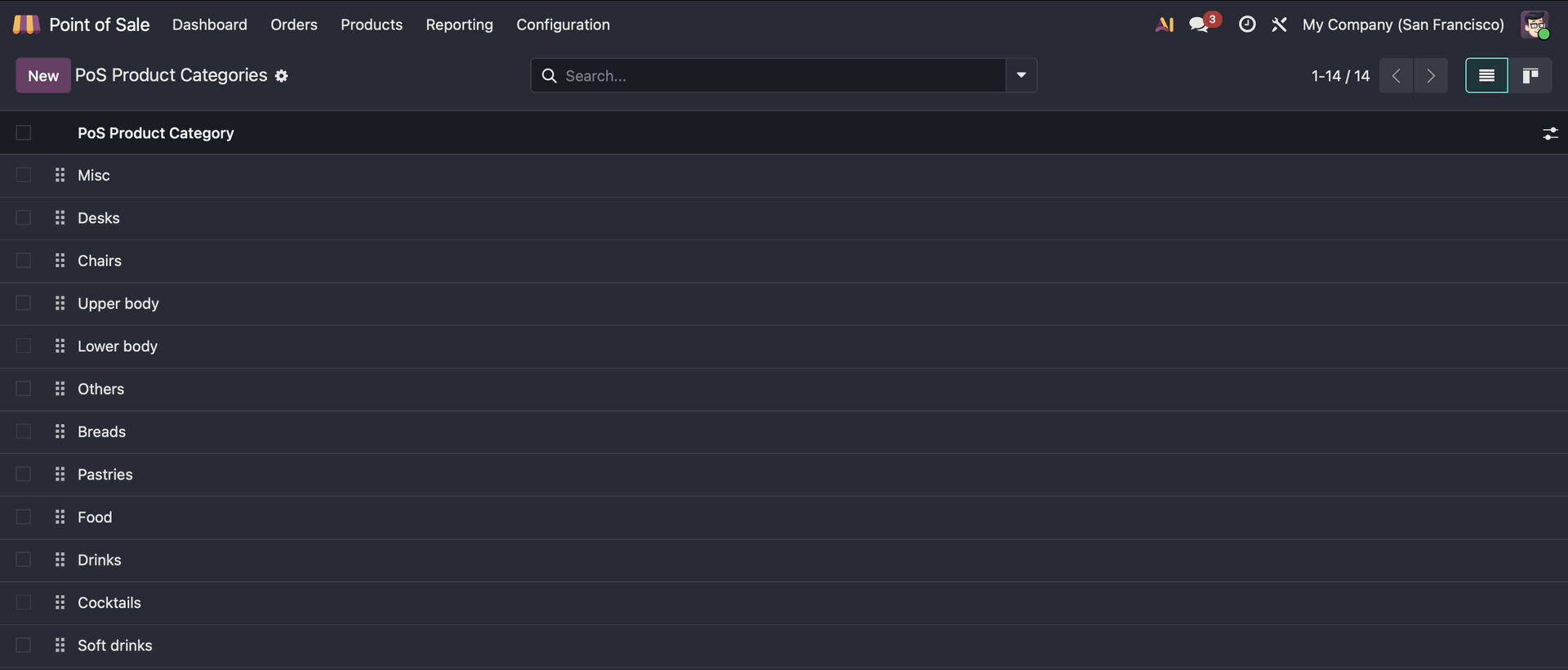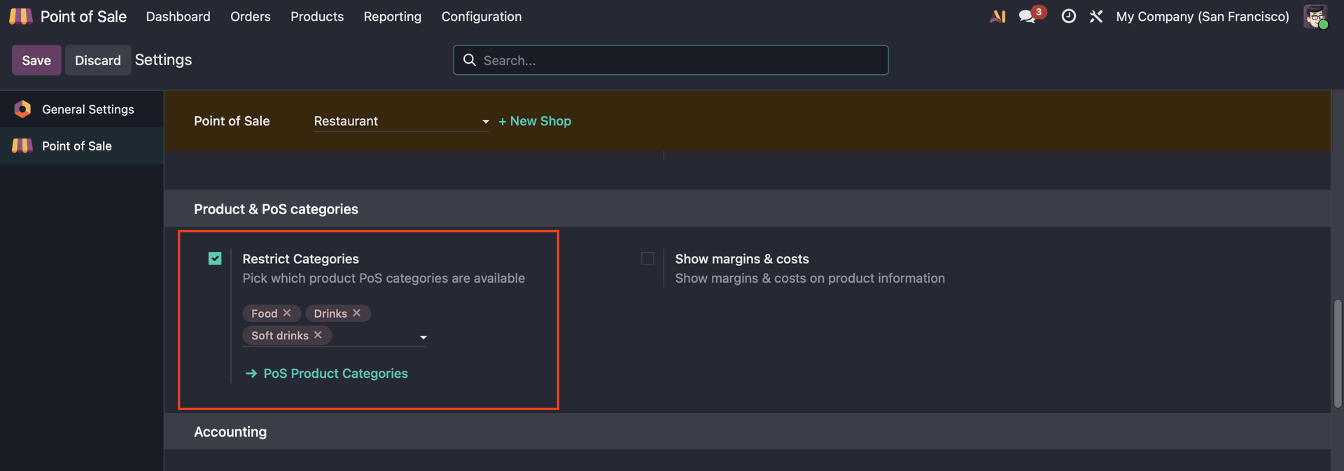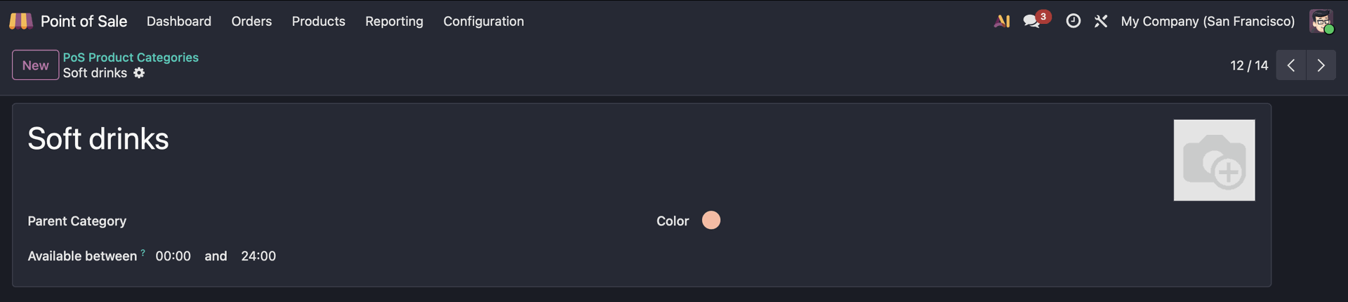นอกจากนี้ ยังสามารถจำกัดหมวดหมู่ที่จะแสดงในระหว่างการใช้งาน POS Session ได้อีกด้วย กล่าวคือ หมวดหมู่บางอย่าง เช่น โต๊ะ (desks) หรือเก้าอี้ (chairs) อาจไม่จำเป็นสำหรับการใช้งานในร้านอาหาร ดังนั้นระบบ POS สามารถแสดงเฉพาะหมวดหมู่สินค้าที่เกี่ยวข้องเท่านั้น