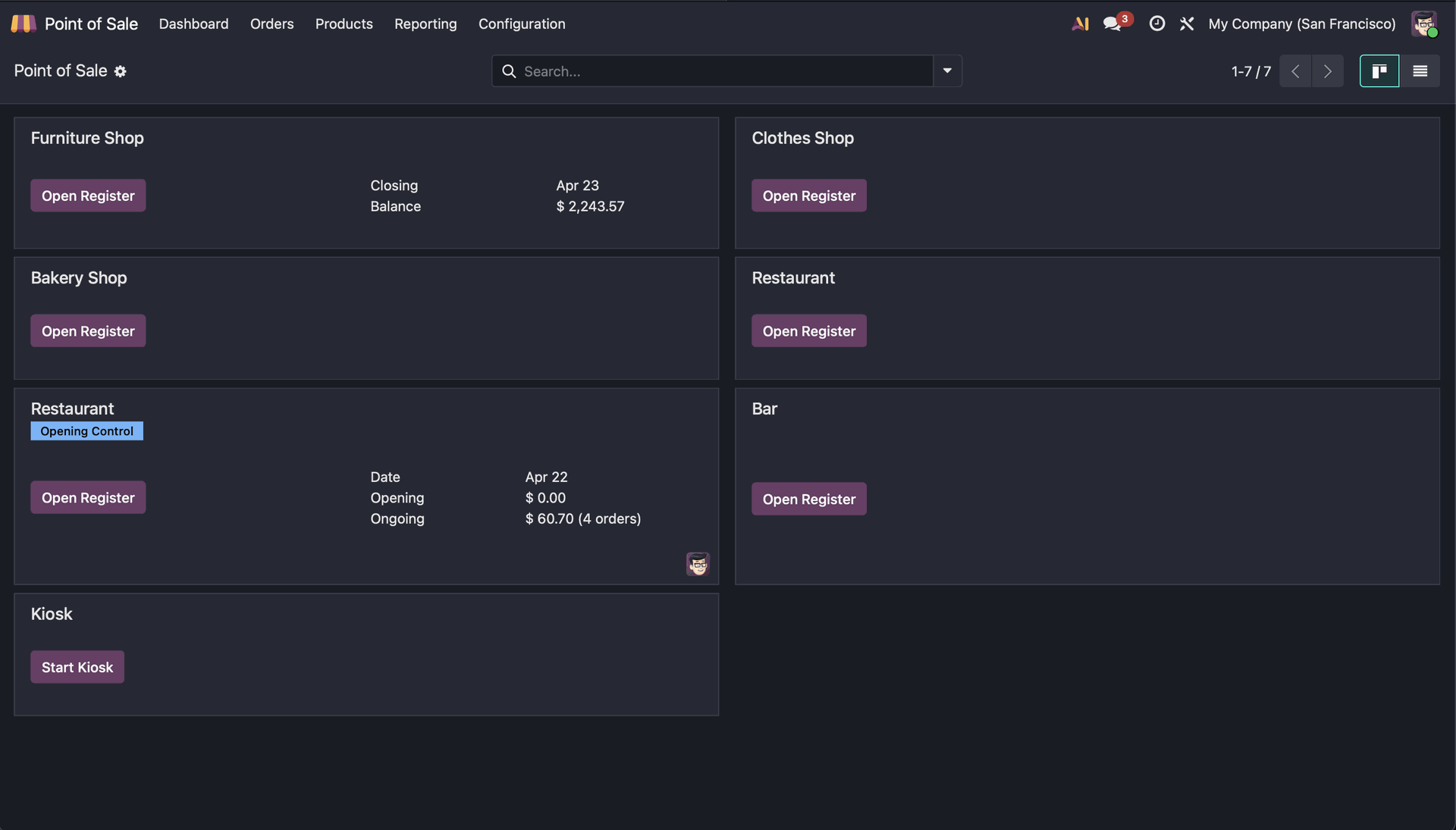 หลังจากไปที่ POS Dashboard แล้ว ให้เลือก PoS session ชื่อ “Restaurant” จากนั้นคลิกปุ่ม Open Register