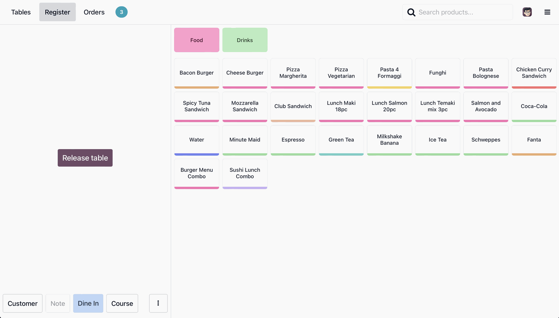 หมวดหมู่สินค้า (POS Categories) ทั้งหมดที่ตั้งค่าไว้สำหรับ session นี้จะแสดงอยู่ด้านบนของหน้าจอ จากนั้นให้ไปที่หมวดหมู่ “Soft drinks” ที่เพิ่งสร้างขึ้น