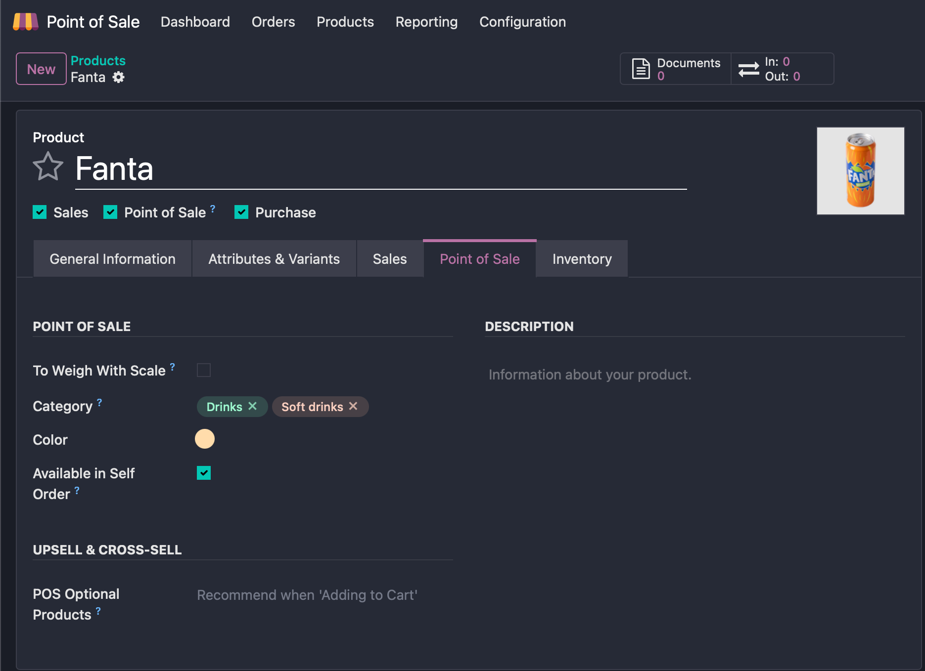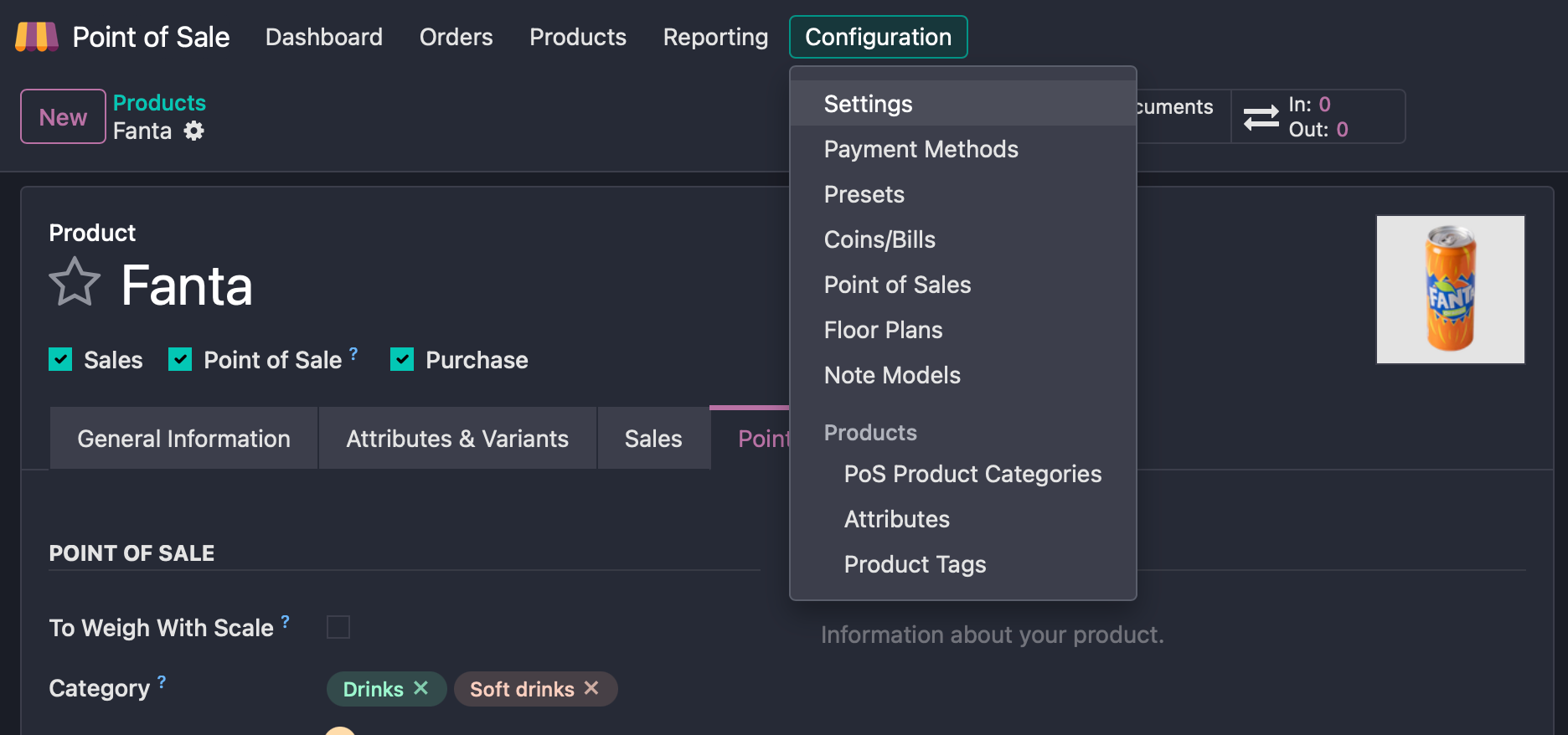เลือกสินค้าที่ต้องการเพิ่มเข้าไปในหมวดหมู่นี้จากหน้ารายการสินค้า (Product) ที่แสดง จากนั้นไปที่แท็บ Point of Sale บนหน้ารายละเอียดสินค้า ซึ่งจะมีฟิลด์ Category อยู่ในส่วนนั้น